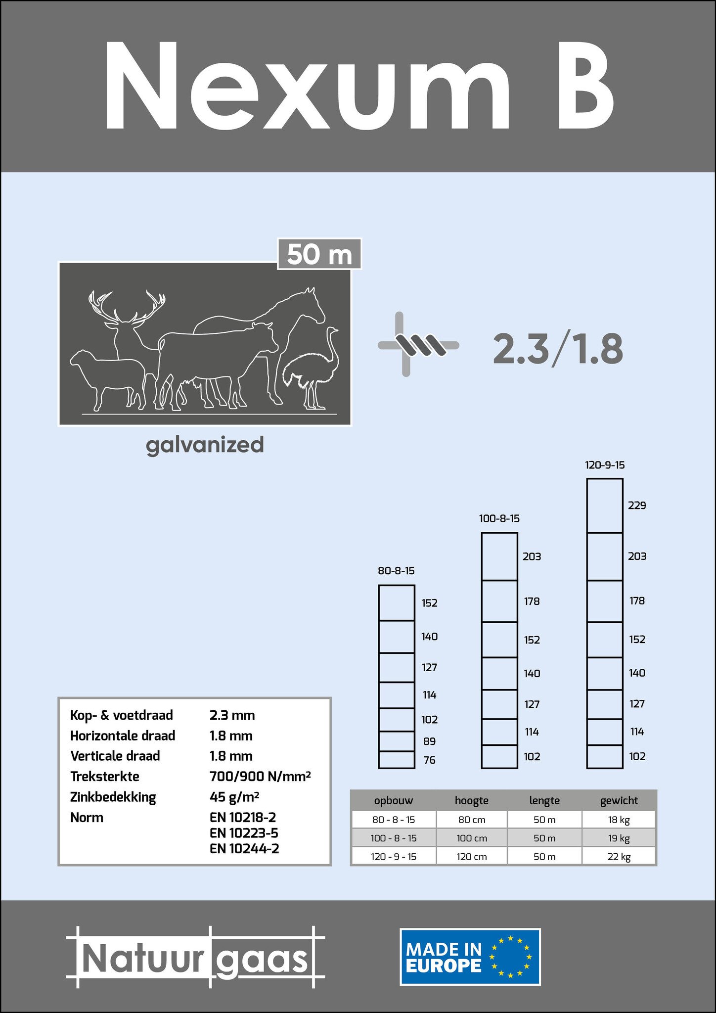 Bestel gemakkelijk en snel ons Nexum basic schapengaas 100 cm 8 draads 2.3/1.8 50 meter. Kop- en voetdraad 2,3 mm, horizontale en verticale draden 1,8 mm. Nexum Basic is voorzien van horizontale draden met een treksterkte van 700-900 N/mm. Goed corrosiebestendig, zinkbedekking 45 g/m. Product conform aan de normen EN 10218-2, EN 10223-5 en EN 10244-2.